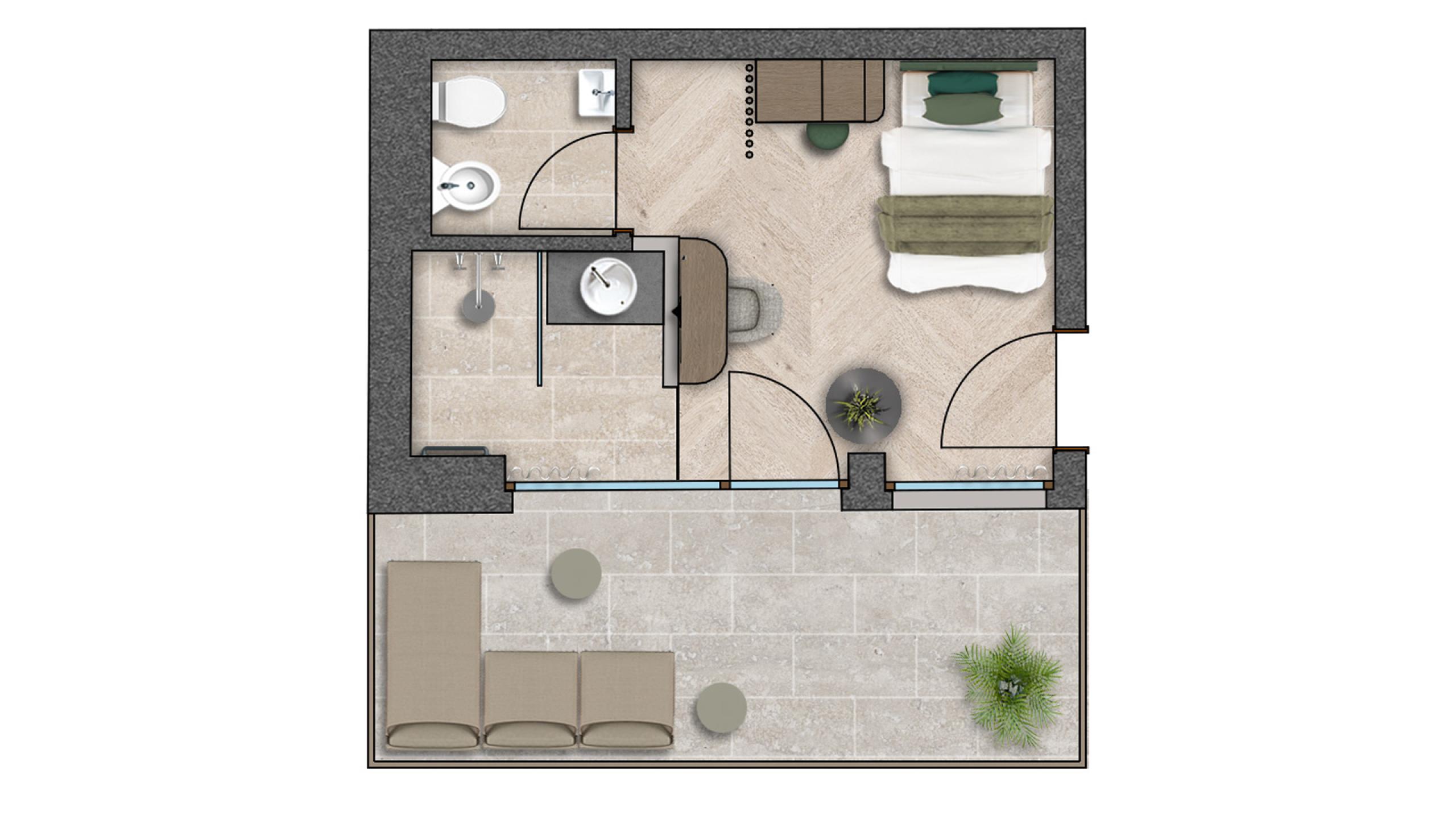Kleines Einzelzimmer, ca. 20 m² für 1 Person mit Seeblick, Holzboden, Komfortbett und modern mediterran eingerichtet, WC und Bidet getrennt, offene begehbare Dusche, TV, Safe, Haarföhn, Minibar, Direktwahltelefon, Garten im Parterre oder Balkonfenster mit Geländer im ersten Stock, Bademantel, Badetasche, Badeschuhe, inklusive Garagenplatz, WIFI kostenlos im ganzen Hotel.